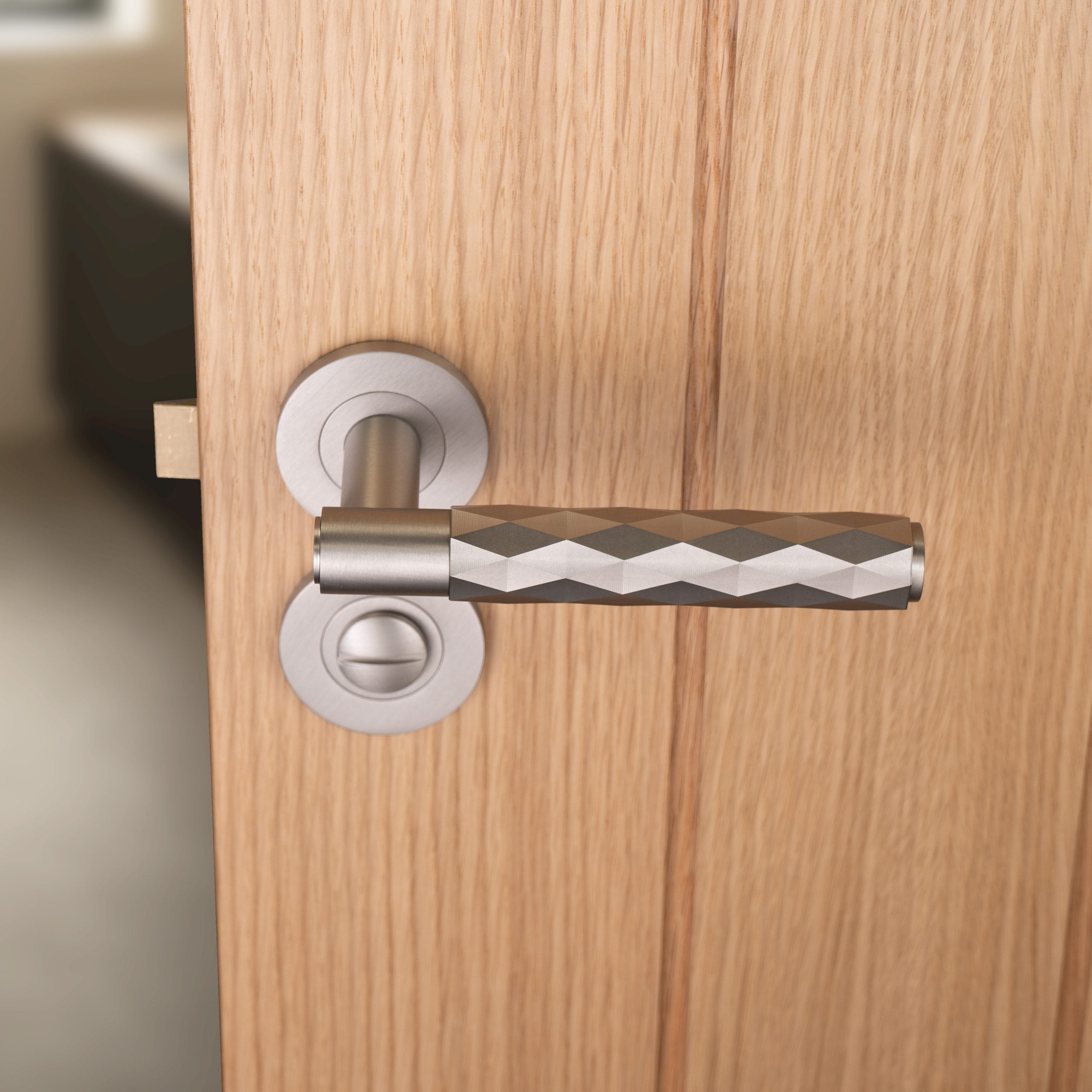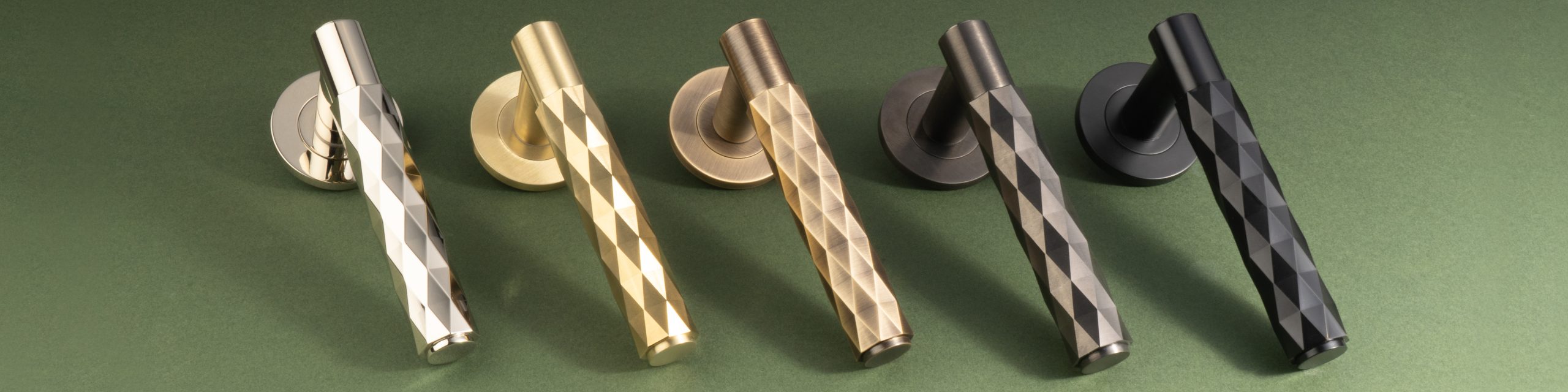 The Spitfire door handle features a modern diamond feel, against a T-bar cylindric stem silhouette, finished with a plain round rose. This contemporary lever door handle has a simple yet decorative innovative-inspired design, leaving a thoroughly modern and luxurious impression. Inspired by the incredibly successful WWII aircraft, the Spitfire.
