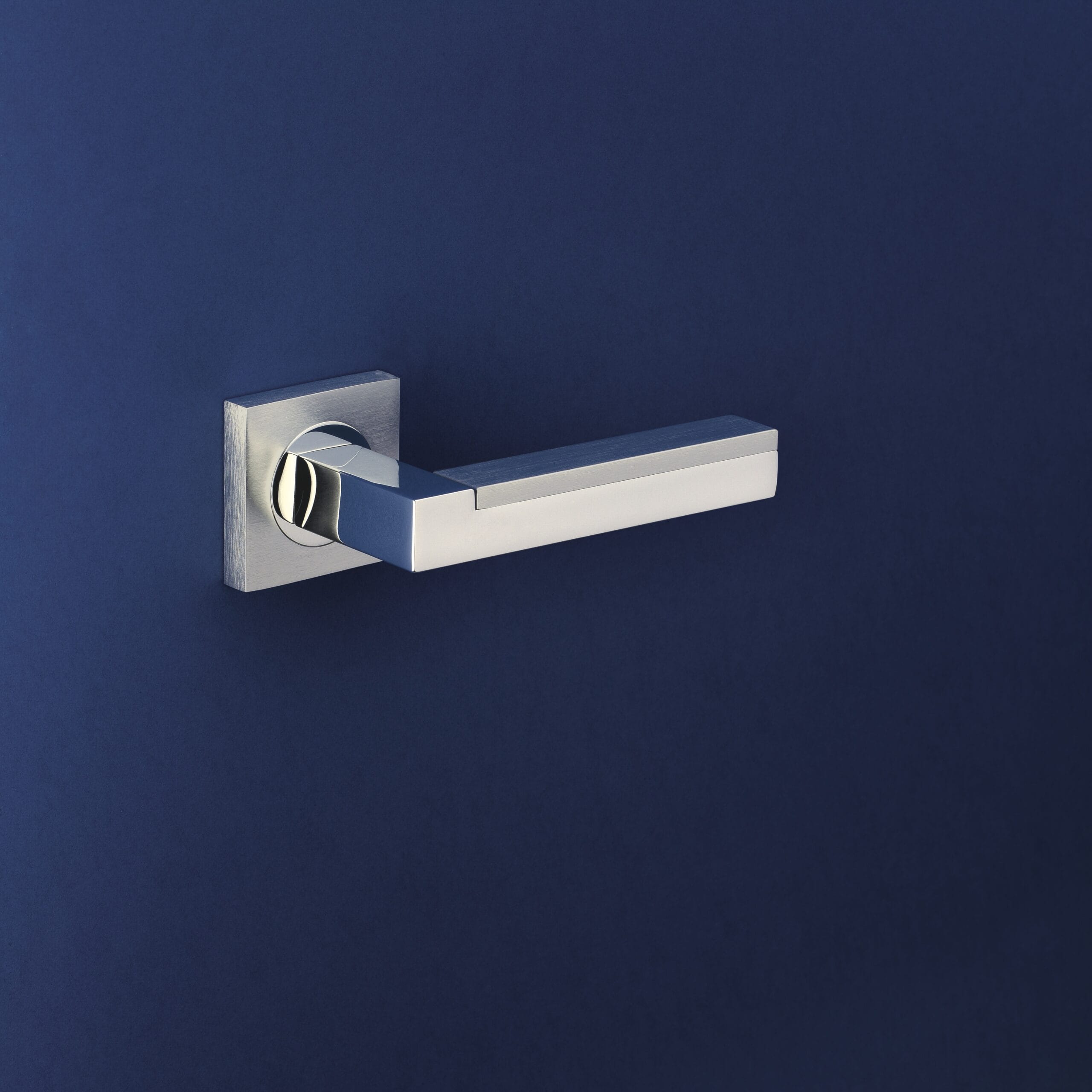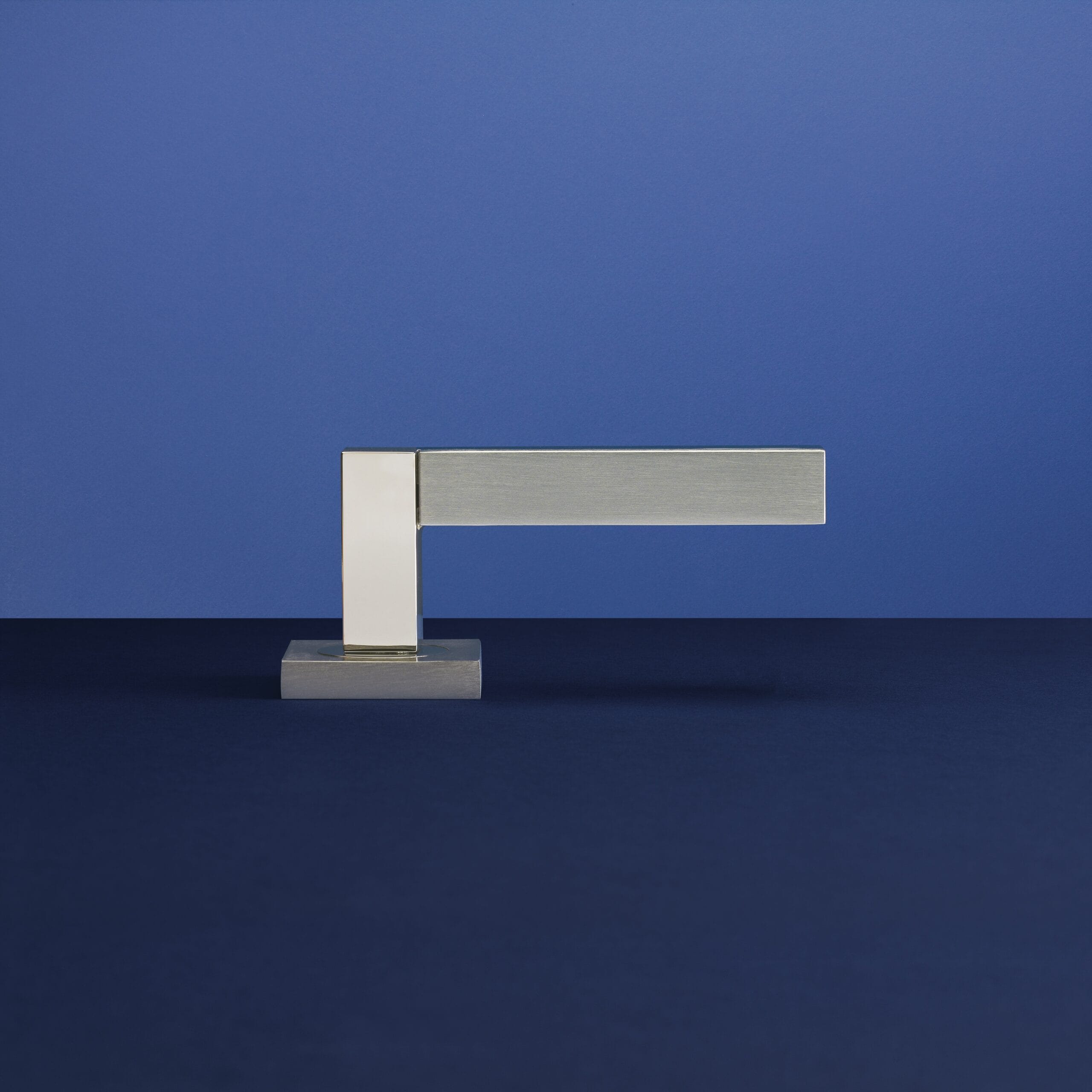 Handle with a squared, essential and impactful design. A combination of basic geometries that skillfully combines materials and shapes, creating a play of proportions and reflection.
