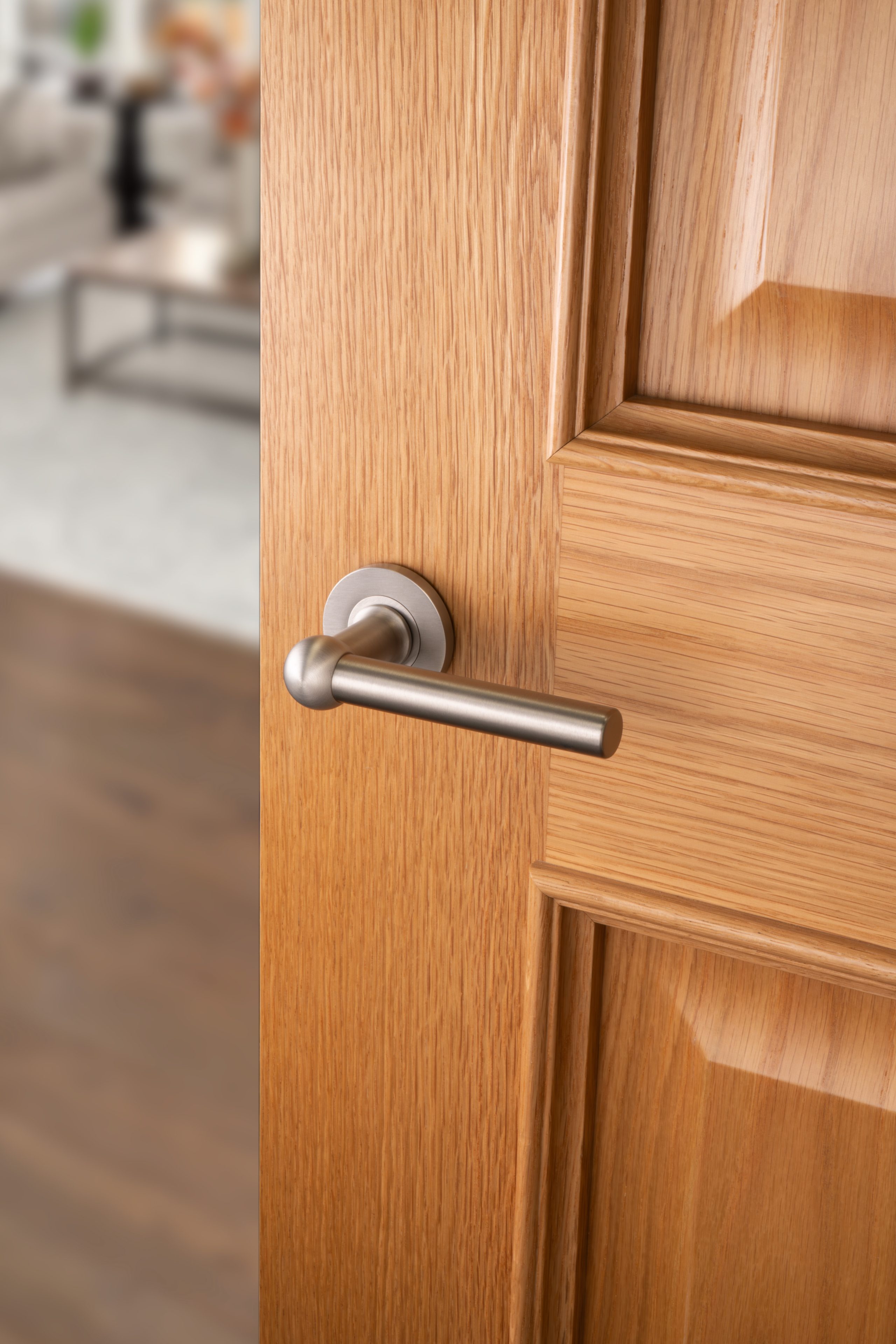 The Siskin door handle features a modern plain barrel lever with a round bulb stem, finished with a plain round rose.